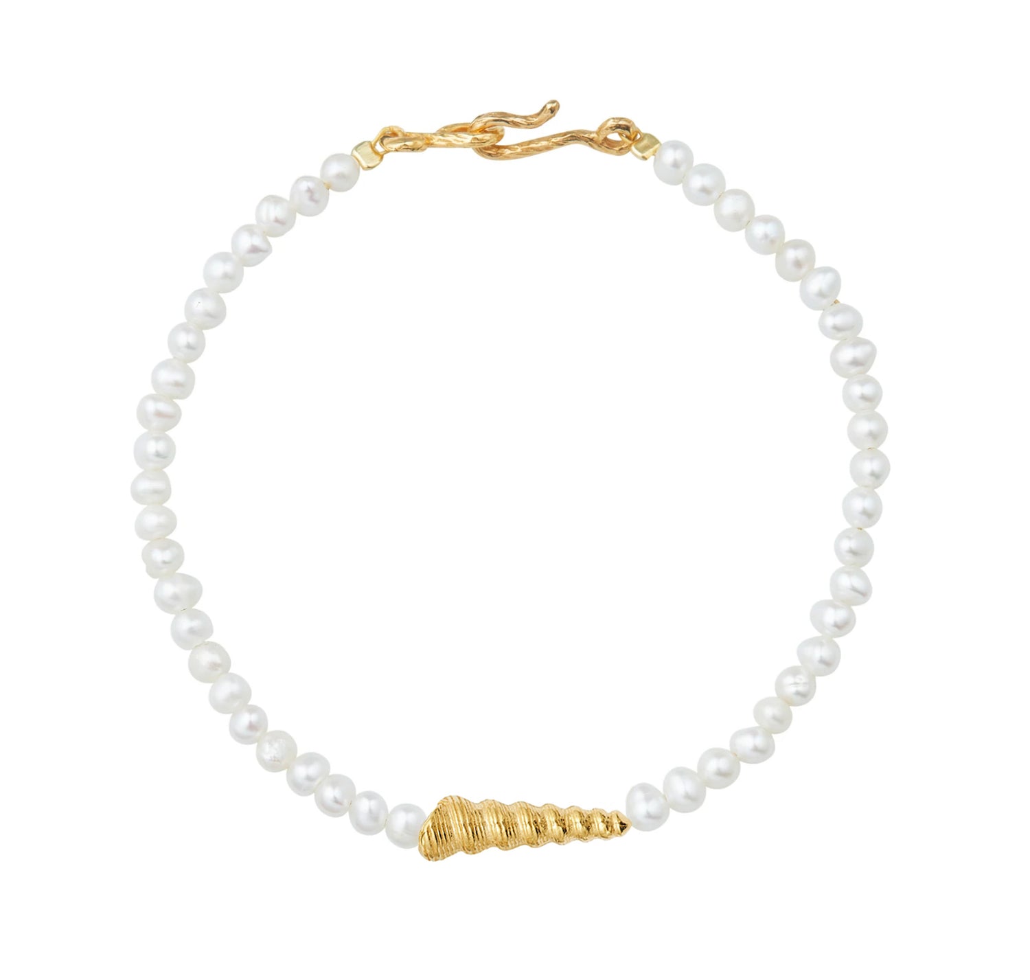 Graceful and quietly striking, the Auger Shell Pearl Bracelet captures the essence of the sea through its sculptural form and luminous natural pearls. Inspired by the delicate silhouette of the auger shell, this piece blends organic beauty with refined detail, creating a wearable tribute to coastal elegance.
