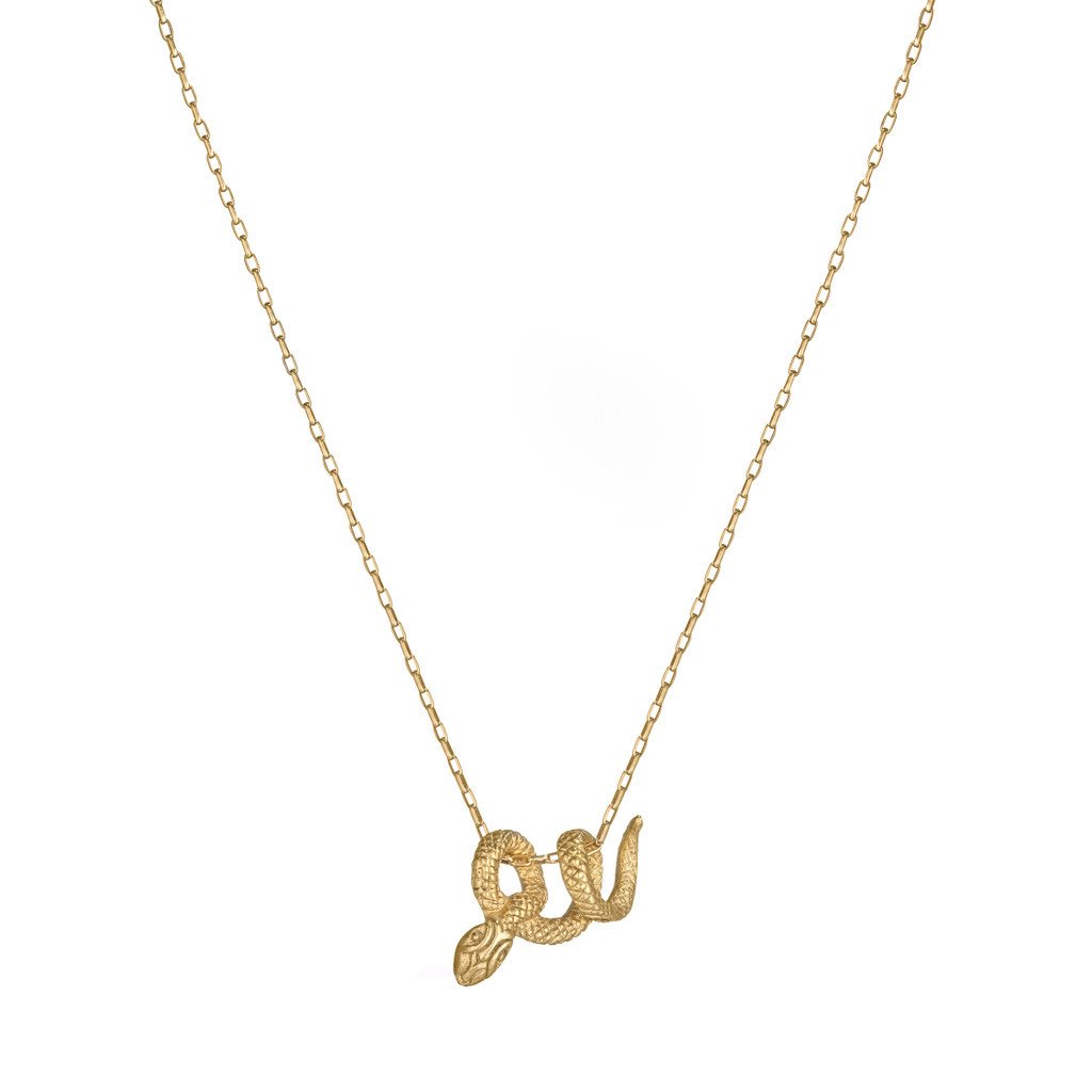 Handcrafted using the lost-wax casting technique, the snake medallion is made from 925 sterling silver, richly plated in 24k gold, and suspended from a matching 24k gold-plated silver chain. Measuring 2.5 cm in length and 1.5 cm in width, the pendant offers a striking presence, while the 47 cm chain allows it to rest just below the collarbone—ideal for statement styling or refined layering.