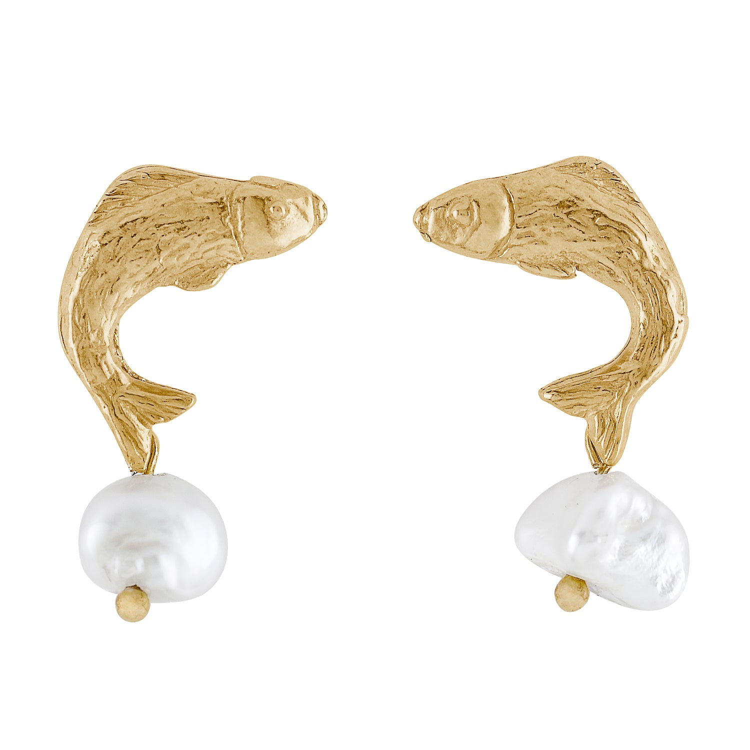 Each pair is meticulously handcrafted in Poland from 925 silver, plated in radiant 24k gold, and shaped using the ancient lost-wax casting technique. The organic silhouette of the fish combined with the soft luster of the pearl creates a poetic, wearable sculpture.